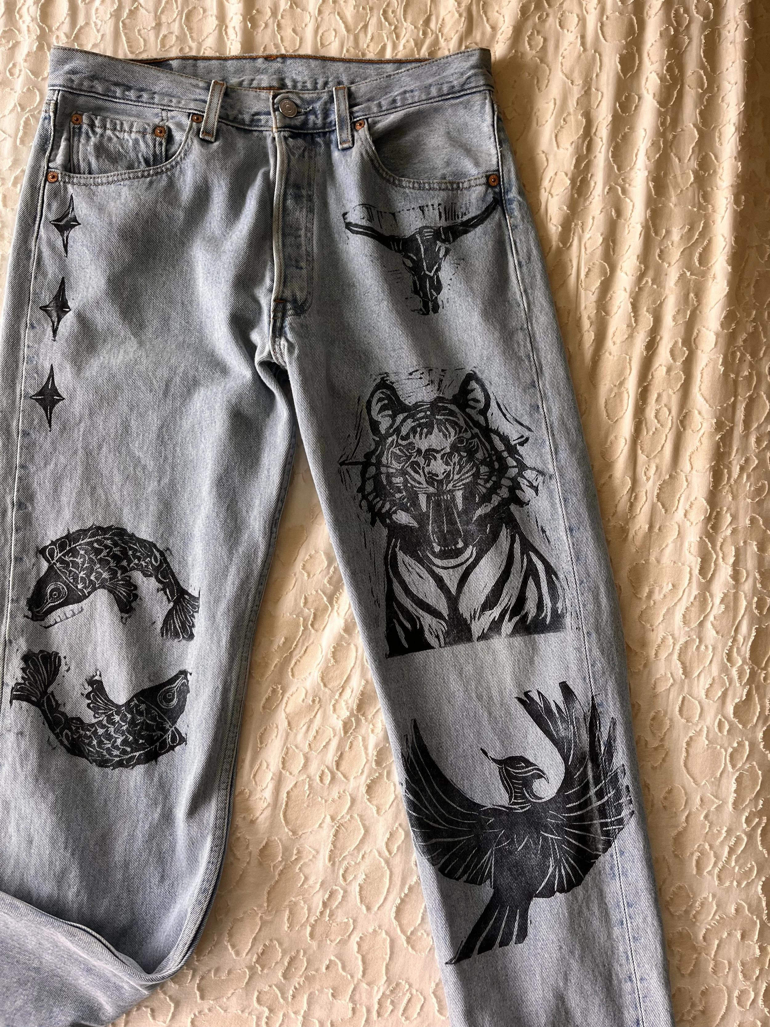 Upcycled or vintage pieces printed by hand with cozy, traditional oil-based ink. Old clothes, new magic.